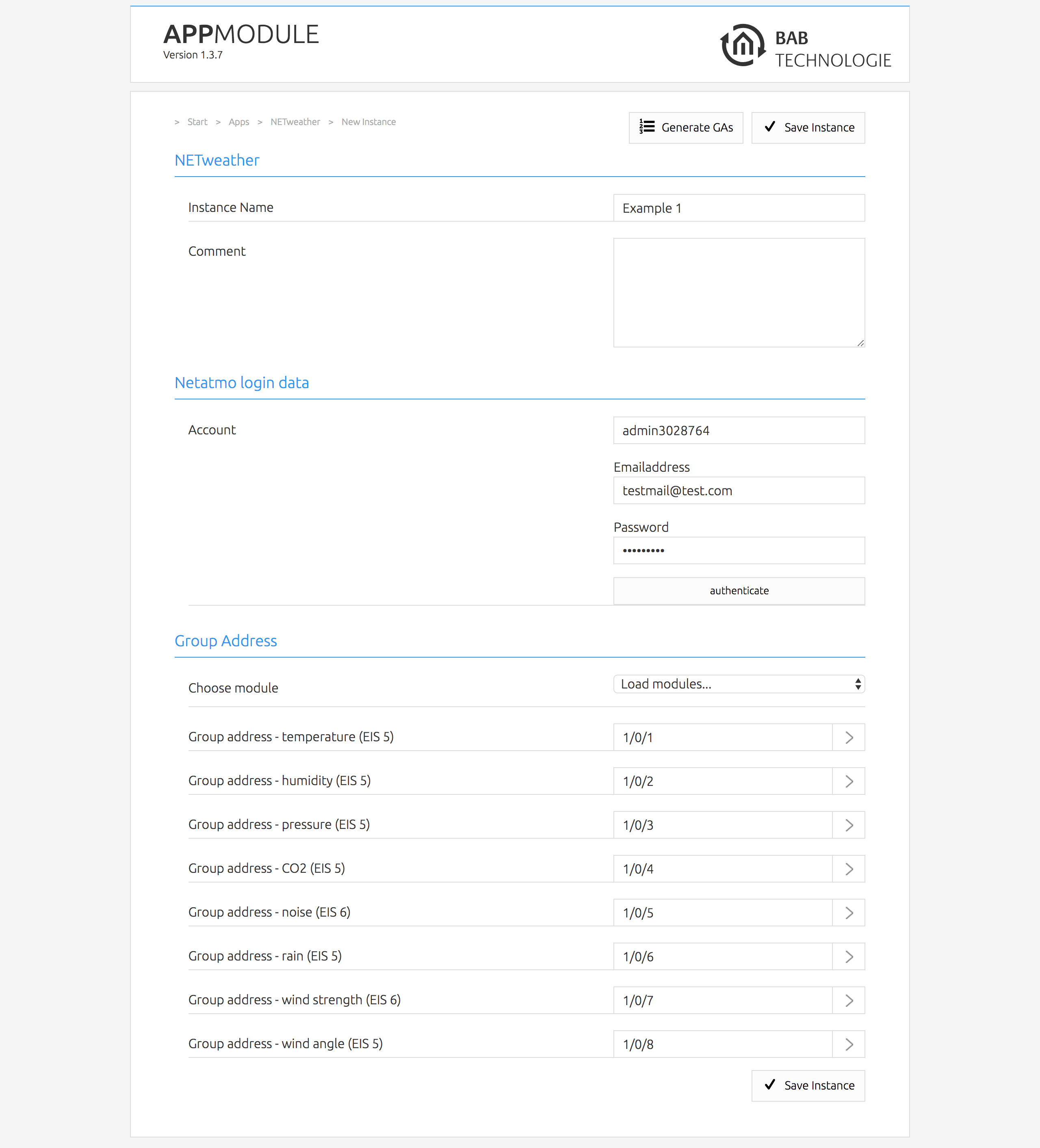 With NETWEATHER for the APPMODULE, you can integrate your Netatmo weather station into your KNX® system. NETWEATHER receives the current measured values at regular intervals from your Netatmo weather station and transmits them to your KNX® system.For example, you can automatically close the exterior blinds should a storm occur. Or link your heating system with the current outside temperature to switch off the heating system at the accordingly outside temperature.