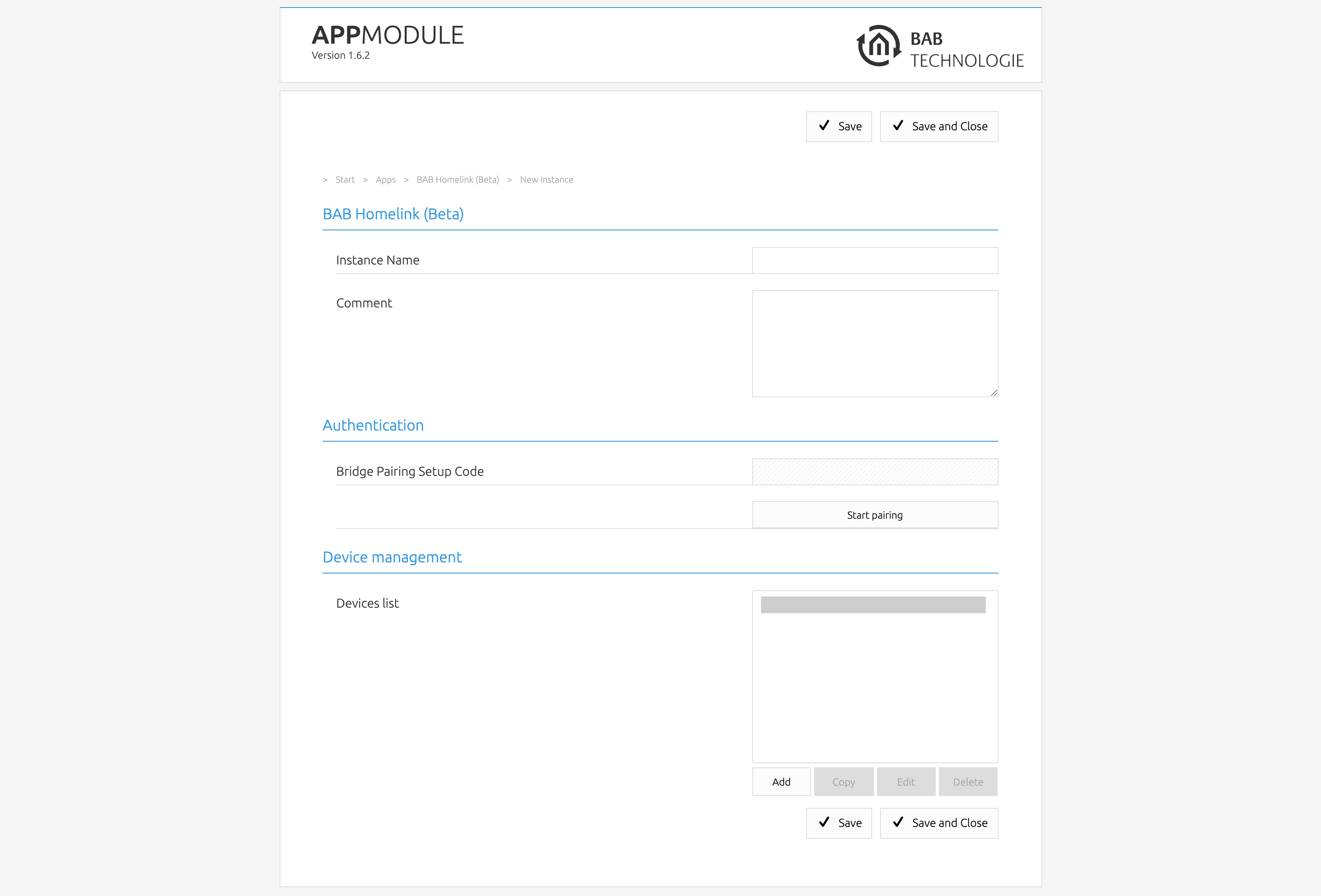Note: This beta version is provided free of charge, but under no circumstances may the beta version of the software be used on or as part of a production system. On Apple® operating systems, the APP MODULE in combination with the app "BAB Homelink (Beta)" is marked as not certified.